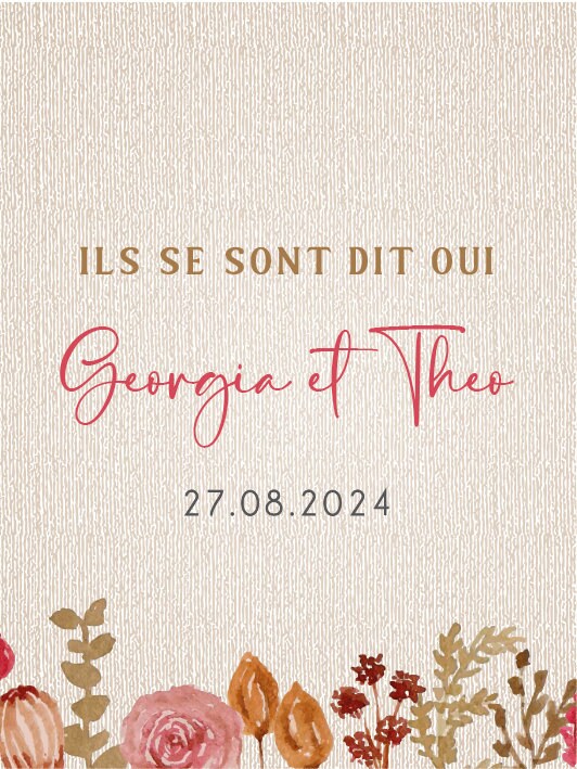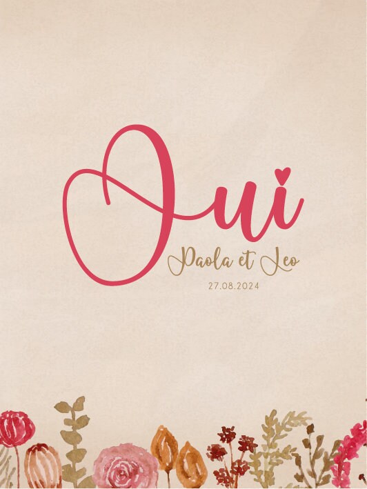 A personalized visual with your first names, the date, and the message of your choice, printed on the selected support. Easel and structure not included. Find our advice on how to choose them in the “Need advice?” section.