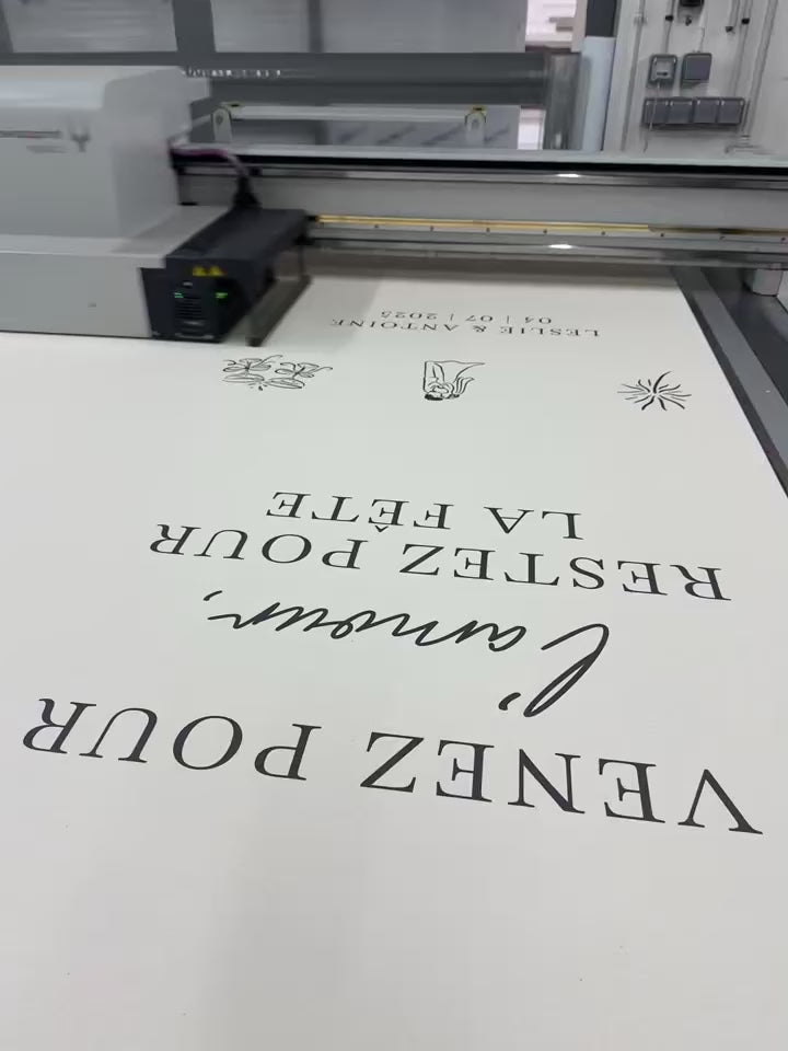Un panneau personnalisé avec vos prénoms, la date et le message de votre choix, imprimé sur le support sélectionné. Chevalet et structure non inclus. Retrouvez nos conseils pour bien les choisir dans la rubrique “Besoin de conseils ?”.